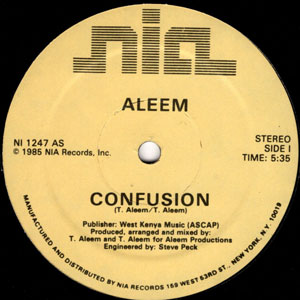| | Aleem Confusion US NIA (1st press) 12 inch Company Sleeve - £6 VG / lots of scuffs / check clip from this copy / sticker on sleeve